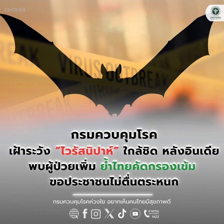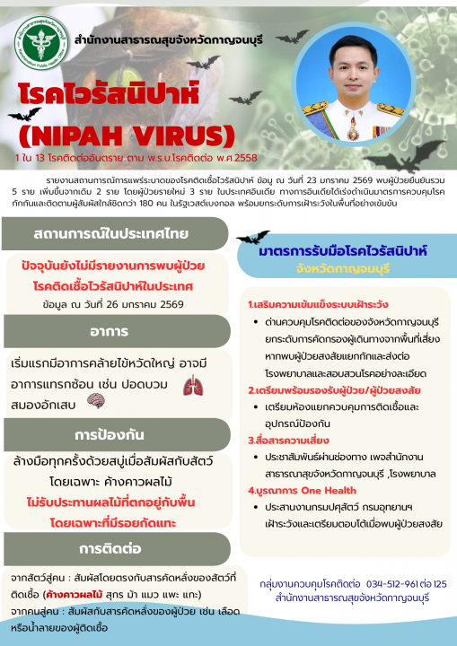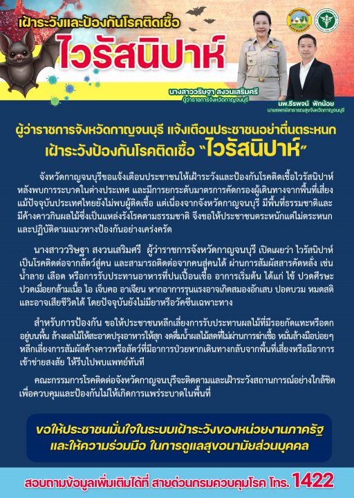 นางสาววริษฐา สงวนเสริมศรี ผู้ว่าราชการจังหวัดกาญจนบุรี ขอแจ้งเตือนประชาชนให้เฝ้าระวังและป้องกันโรคติดเชื้อไวรัสนิปาห์ หลังพบการระบาดในต่างประเทศ และมีการยกระดับมาตรการคัดกรองผู้เดินทางจากพื้นที่เสี่ยง แม้ปัจจุบันประเทศไทยยังไม่พบผู้ติดเชื้อ แต่เนื่องจากจังหวัดกาญจนบุรี มีพื้นที่ธรรมชาติและ มีค้างคาวกินผลไม้ซึ่งเป็นแหล่งรังโรคตามธรรมชาติ จึงขอให้ประชาชนตระหนักแต่ไม่ตระหนก และปฏิบัติตามแนวทางป้องกันอย่างเคร่งครัด