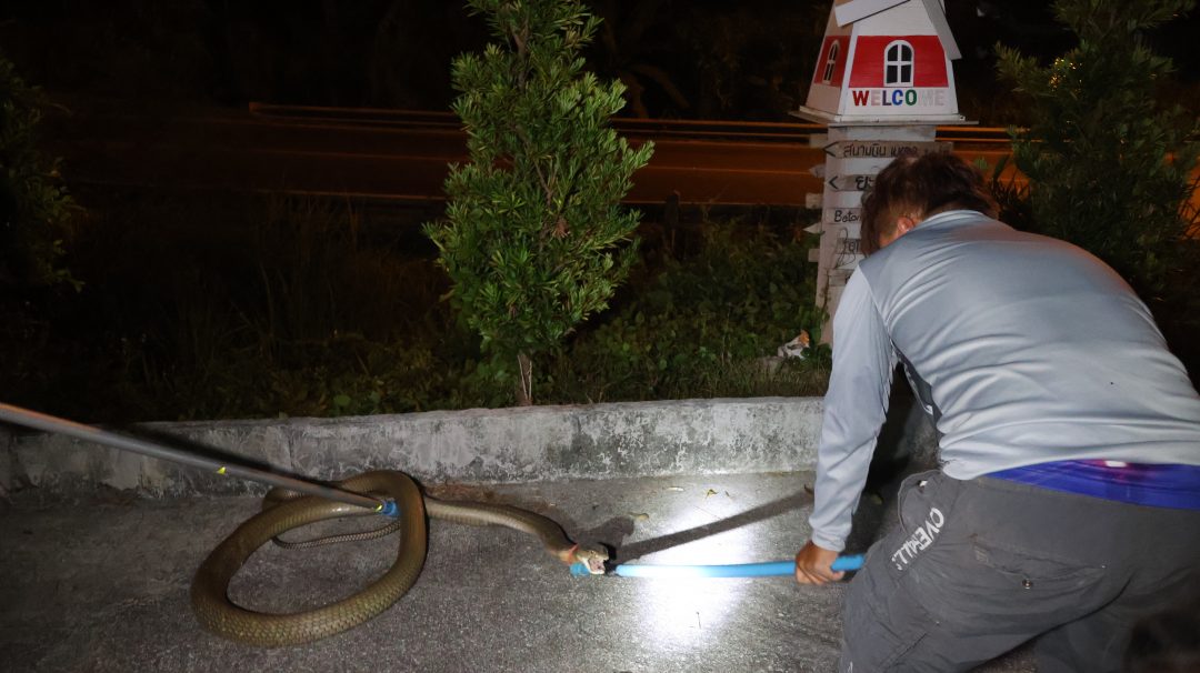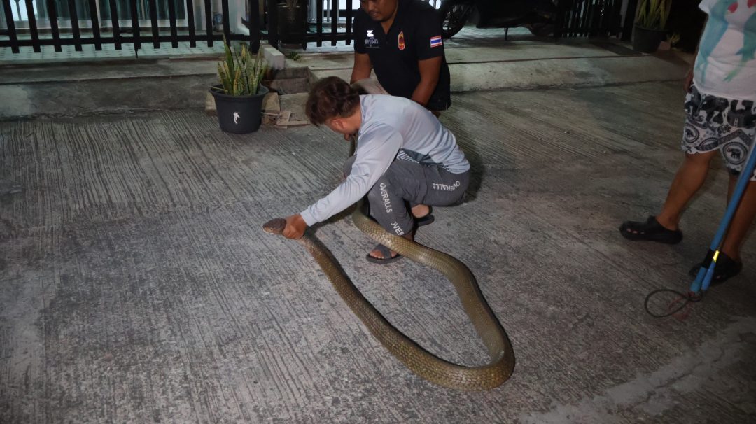 นายนุชดีน หวันสมัน เจ้าของบ้าน เล่าว่า แฟนของตนได้ขี่รถกลับมาจากข้างนอกกำลังจะเข้าบ้าน ก็เห็นงูเลื้อยออกมาจากคูน้ำ เมื่องูเห็นแฟนของตน ก็เลื้อยกลับลงไปในคู แฟนตนตกใจและกลัวงูมาก จึงได้เข้าบ้านปิดประตูขึ้นไปอยู่บนชั้นสองของบ้าน แล้วโทรศัพท์แจ้งเจ้าหน้าที่และตนให้มาช่วยกันจับงูเพื่อนำไปปล่อยคืนสู่ป่าธรรมชาติต่อไป