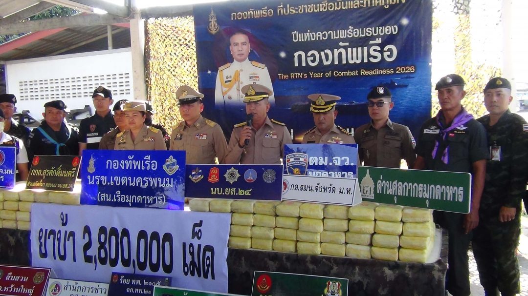 นายวรญาณ บุญณราช ผู้ว่าราชการจังหวัดมุกดาหาร พล.ร.ต.ณรงค์ เอมดี ผู้บัญชาการหน่วยเรือรักษาความสงบเรียบร้อยตามลำแม่น้ำโขง น.อ.แมนรัตน์ บุญสวัสดิ์ ผู้บังคับหน่วยเรือรักษาความสงบเรียบร้อยตามลำแม่น้ำโขงเขตนครพนม น.ท.โอรส พุทธโค หัวหน้าสถานีเรือมุกดาหาร พร้อมด้วย พ.ต.อ.เจด็จ ปรีพลู ผกก.สภ.หว้านใหญ่ พ.ต.อ.ธนิสร แสงท่านั่ง ผกก.ตรวจคนเข้าเมืองมุกดาหาร นายอำเภอหว้านใหญ่ ตชด.234 ทหารพรานที่ 2105 กองกำลังสุรศักดิ์มนตรี และหน่วยงานความมั่นคงในพื้นที่ ร่วมกันแถลงการณ์จับกุมยาบ้าจำนวน 2,800,000 เม็ด พร้อมเรือกีบเพลายาวจำนวน 1 ลำ