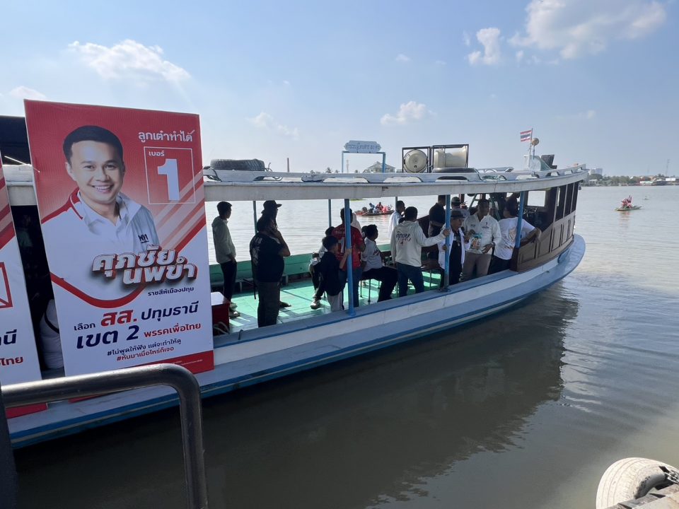 ขบวนเรือเริ่มต้นจากตำบลบางปรอก (เขตเทศบาลเมืองปทุมธานี) ล่องผ่านอำเภอสามโคกไปยังตำบลท้ายเกาะ ก่อนจะวกกลับทางฝั่งตะวันออกผ่านตำบลเชียงรากน้อยและตำบลบางกะดี มีกลุ่มชาวบ้านและคนหาปลา นำเรือเครื่องหางยาวและเรือตกกุ้งกว่า 10 ลำ มาร่วมขับขบวนติดตามและให้กำลังใจตลอดเส้นทาง ประชาชนสองฝั่งแม่น้ำเจ้าพระยาต่างออกมาโบกมือให้กำลังใจและส่งเสียงเชียร์ “เพื่อไทย” และ “ลูกเต๋า” อย่างหนาแน่น สะท้อนถึงฐานเสียงดั้งเดิมที่เหนียวแน่นในพื้นที่ริมน้ำ