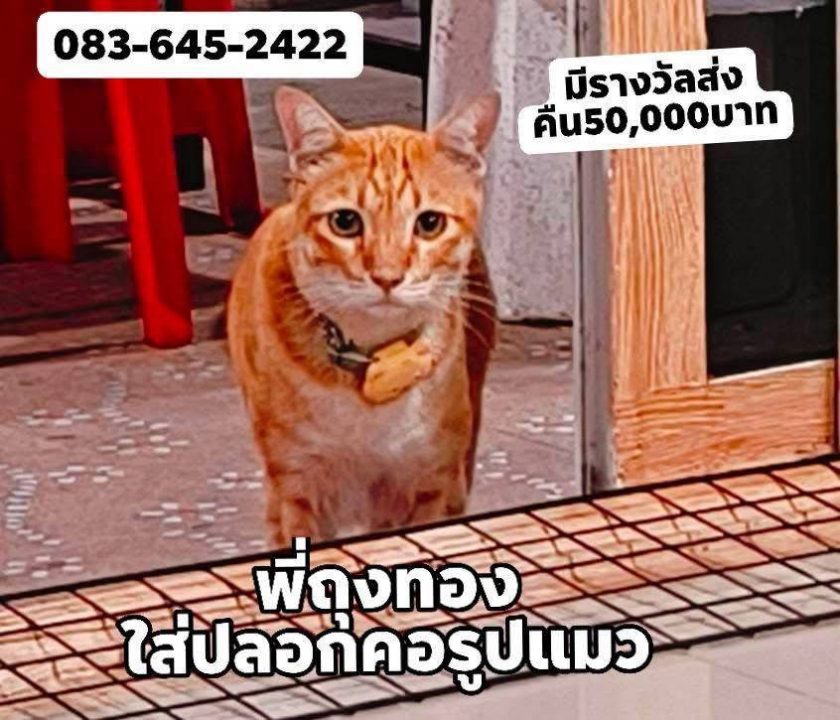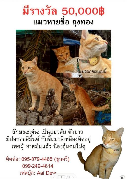 จากกรณีมีผู้โพสต์ระบุข้อความว่า มีรางวัล 50,000฿ แมวหายชื่อ ถุงทองปลอกคอแบบนี้ ลักษณะเด่น: เป็นแมวส้ม ตัวยาวมีปอกคอสีมิ้นต์ กับจี้แมวสีเหลืองติดอยู่เพศผู้ ทำหมันแล้ว น้องคุ้นคนไม่ดุ ผู้สื่อข่าวลงพื้นที่ ต.ละหาร อ.บางบัวทอง จ.นนทบุรี พบ นายปฐวีกรณ์ ปัจจุทกา อายุ 53 ปี และพี่ณัฐชยา ซึ่งเป็นภรรยา นายปฐวีกรณ์ เล่าว่า ตนและครอบครัวประกอบกิจการอสังหาริมทรัพย์ และช่วง 6 ปีที่ผ่านมาตนและครอบครัวได้น้องแมวมาตั้งแต่ตัวเล็กๆมาเลี้ยงตั้งชื่อว่าถุงทองซึ่งเป็นแมวเพศผู้หางขอดเป็นแมวมงคลเป็นแมวส้ม ตัวยาว มีปอกคอสีมิ้นต์ กับจี้แมวสีเหลืองติดอยู่ที่คอซึ่งทางบ้านก็เลี้ยงถุงทองมาเป็นเวลา 6 ปี จะเป๋นแมวที่น่ารักขี้อ้อนไม่กลัวคนซึ่งทางบ้านก็เลี้ยงถุงทองเหมือนลูกคนหนึ่งเป็นสมาชิคในครัอบครัวนอนด้วยกันและเมื่อวันที่ 22 ม.ค ที่ผ่านมาถุงทองได้หายออกจากบ้านไปซึ่งวันนั้นตนและภรรยาไปต่างจังหวัดและลูกๆโทรบอกตนว่าถุงทองหายออกจากบ้านพอตนกับมากได้ออกตามหาถุงและได้นำรูปถุงทองไปติดตามที่ต่างๆและแจกตามทองตลาดเผื่อว่าใครจะพบเห็นและตนได่ตั้งรางวัลถ้าใครพบเห็นครั้งแรกตนให้ 5,000 บาทและได้เพิ่มขึ้น มาเป็น 20000 บาม และเพิ่มขึ้นมาอีกเป็น 50,000 บาทและตนจะเพิ่มขึ้นมาอีกเป็น 100,000 บาท ถ้าใครพบเห็นก็ขอให้เอาน้งมาคืนซึ่งตนคิดว่าถุงทองน่าจะติดรถไปเวลาที่คนเข้ามาส่งของเพราะถุงทองชอบแอบขึ้นไปนอนบนรถซึ่งที่ผ่านมาถุงทองก็ติดรถลูกน้องออกไปข้างนอก 3-4 ครั้งแต่ก็ได้คืนแต่ครั่งนี้หายไปหลายวันตนคิดว่าถุงทองน่าจะติดรถคนอื่นออไปไกลซึ่งที่ผ่านมาตนและภรรยาก็ออกตามหาถุงทองมาตลอดบางวันตี 3 ก็พากันขับรถออกไปหาตามซอยต่างๆแต่ก็ไม่เจอบ่อยครั้งที่มีคนโทรมาแจ้งว่าเจอถุงทองแล้วพอตนไปดูก็ไม่ใช่และเมื่อวานที่ผ่านมาก็ให้คนในบ้านออกตามหาก็ไม่เจอและในวันนี้ก็จะทำใบปลิวไปติดตามหาให้ไกลขึ้นและที่ผ่านมาก็ประกศตามหาทางโซเซียลด้วย