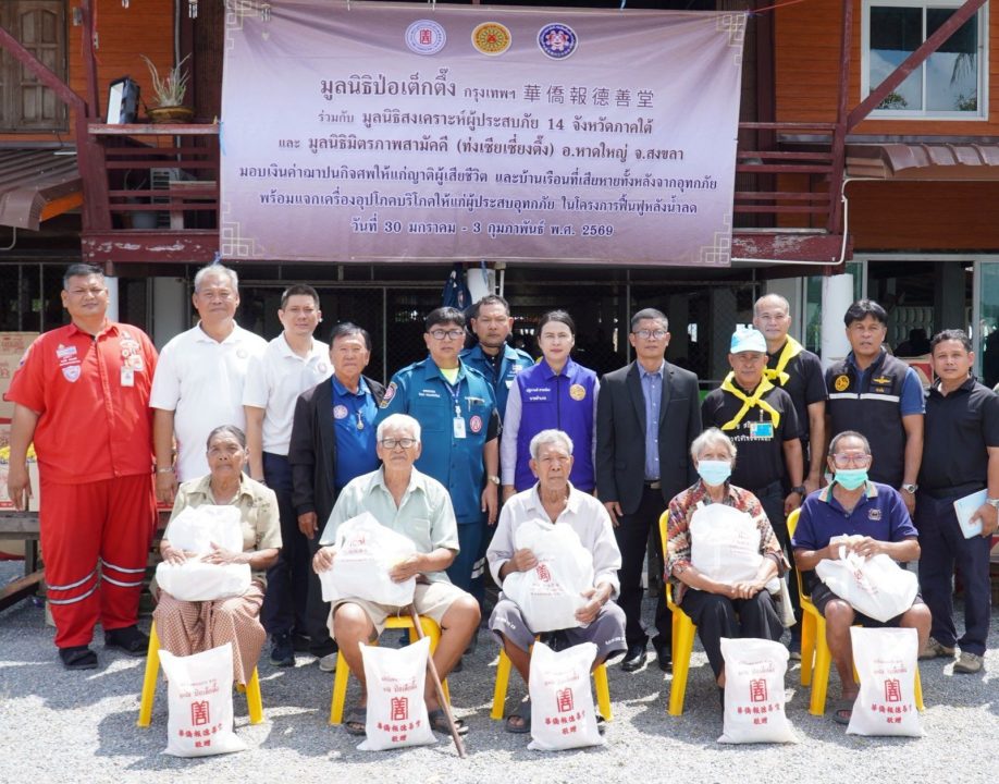 มูลนิธิป่อเต็กตึ๊ง นำโดย นายวิเชียร เตชะไพบูลย์ ประธานกรรมการ ห่วงใยผู้ประสบอุทัยภัยภาคใต้ มอบหมายให้ นายรัชพร ประสงค์ทรัพย์ หัวหน้าแผนกสาธารณภัย พร้อมด้วยเจ้าหน้าที่ แผนกบรรเทาสาธารณภัย แผนกบัญชี/การเงิน แผนกหน่วยแพทย์สงเคราะห์ชุมชน ลงพื้นที่ 9 จังหวัดภาคใต้ ช่วยเหลือผู้ประสบอุทกภัย ในโครงการฟื้นฟูหลังน้ำลด ประกอบด้วย จังหวัดยะลา ปัตตานี สงขลา สตูล พัทลุง นครศรีธรรมราช นราธิวาส ตรัง และสุราษฎร์ธานี โดยแจกจ่ายเครื่องอุปโภคบริโภค อาทิ ข้าวสาร บะหมี่กึ่งสำเร็จรูป ปลากระป๋อง น้ำมันพืช และน้ำปลา รวม 31,500 ชุด ๆ ละ 450 บาท มอบเงินช่วยเหลือแก่ผู้ประสบภัยที่บ้านเรือนเสียหายทั้งหลัง รายละ 12,000 บาท รวม 25 ราย และมอบเงินสงเคราะห์ค่าฌาปนกิจให้แก่ญาติผู้เสียชีวิต รายละ 20,000 บาท จำนวน 189 ราย รวมงบประมาณกว่า 18.25 ล้านบาท โดยมี ผู้แทนจากหน่วยงานรัฐเป็นประธานในพิธี พร้อมทั้งมูลนิธิสงเคราะห์ 14 จังหวัดภาคใต้ และ สมาคม/มูลนิธิแต่ละจังหวัด เป็นผู้ประสานงานและร่วมให้ความช่วยเหลือ.