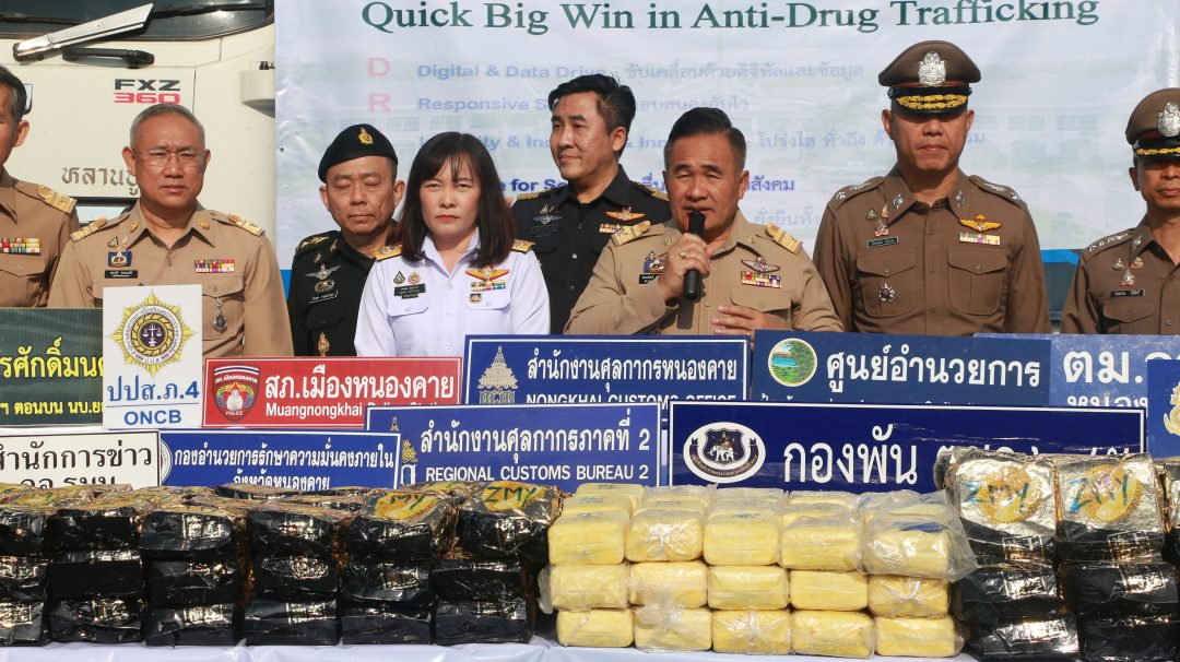 ที่ด่านพรมแดนหนองคาย (สะพานมิตรภาพไทย-ลาว แห่งที่ 1) ฝั่งขาเข้าประเทศไทย อ.เมืองหนองคาย นายศรัณย์ศักด์ ศรีเครือเนตร ผู้ว่าราชการจังหวัดหนองคาย,พล.ต.ต อัทธชนน์ ช่วงงาม ผบก.ภ.จว.หนองคาย ,พันเอกอุดมการณ์ ศรีแขไตร รองผู้บังคับการกองบังคับการควบคุมที่ 2 กกล.สุรศักดิ์มนตรี,นางสาววรรณา ผู้อุตส่าห์ นายด่านศุลกากรหนองคาย,พ.ต.อ.จิรวิทย์ ปานยิ้ม ผกก.สภ.เมืองหนองคาย และหน่วยงานความมั่นคงในพื้นที่ แถลงข่าวการจับกุม นายสุรสิทธิ์ อายุ 40 ปี และ นายสมโชค อายุ 40 ปี ได้พร้อมของกลางยาเสพติดประเภท 1 (ยาบ้า)กว่า200,000 เม็ด,ไอซ์ กว่า 169 กก.ซุกในรถพ่วงบรรทุก 18 ล้อ 2 คัน การจับกุมโดยการอำนวยการของ พ.อ.ชูชาติ นนทบุตร ผบ.บก.ควบคุมที่ 2 (ร.13) ,พ.อ.อุดมการณ์ ศรีแขไตร รอง ผบ.บก.ควบคุมที่ 2 (ร.13),นางสาววรรณา ผู้อุตส่าห์ นายด่านศุลกากรหนองคาย