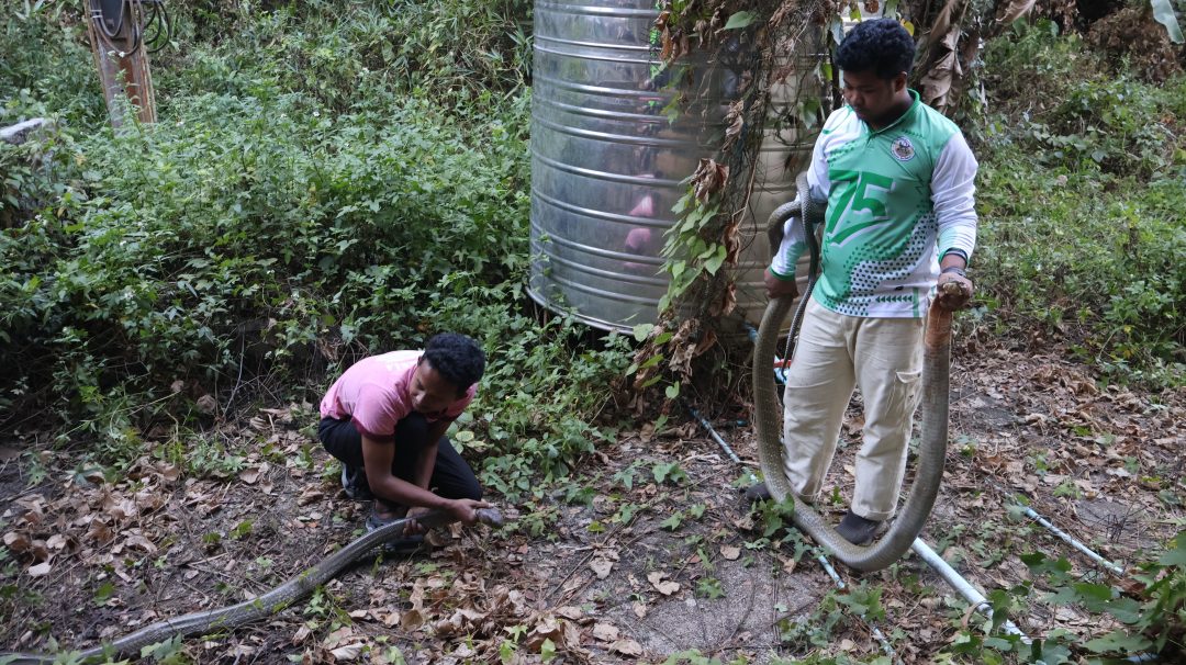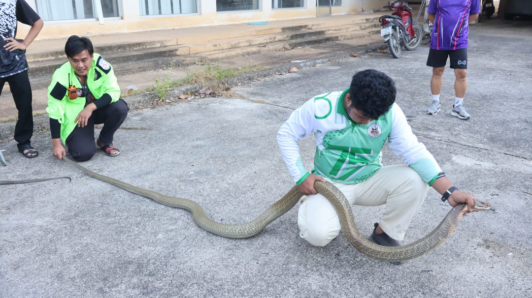 เมื่อไปถึงพบงูจงอางตัวใหญ่ 2 ตัว มีลักษณะเหมือนกำลังต่อสู้กัน ส่วนอีกตัว ซึ่งมีขนาดเล็กกว่า ได้เลื้อยหนีหายเข้าไปในป่าสวนยางพาราแล้ว อาสาสมัครกู้ชีพกู้ภัยมุสลิมเบตง จึงได้แยกงูทั้ง 2 ตัว ออกจากกัน และใช้บ่วงคล้องคองู ใช้เวลาประมาณ 10 นาที ก็สามารถจับงูทั้ง 2 ตัวได้ วัดขนาดความยาวตัวแรกได้ 3.81 เมตร น้ำหนักประมาณ 7.1 กิโลกรัม อีกตัวมีขนาดความยาวประมาณ 3.74 เมตร น้ำหนักประมาณ 6.6 กิโลกรัม มีบาดแผลที่บริเวณลำตัว จึงนำใส่กระสอบเพื่อนำไปปล่อยคืนสู่ป่าธรรมชาติ