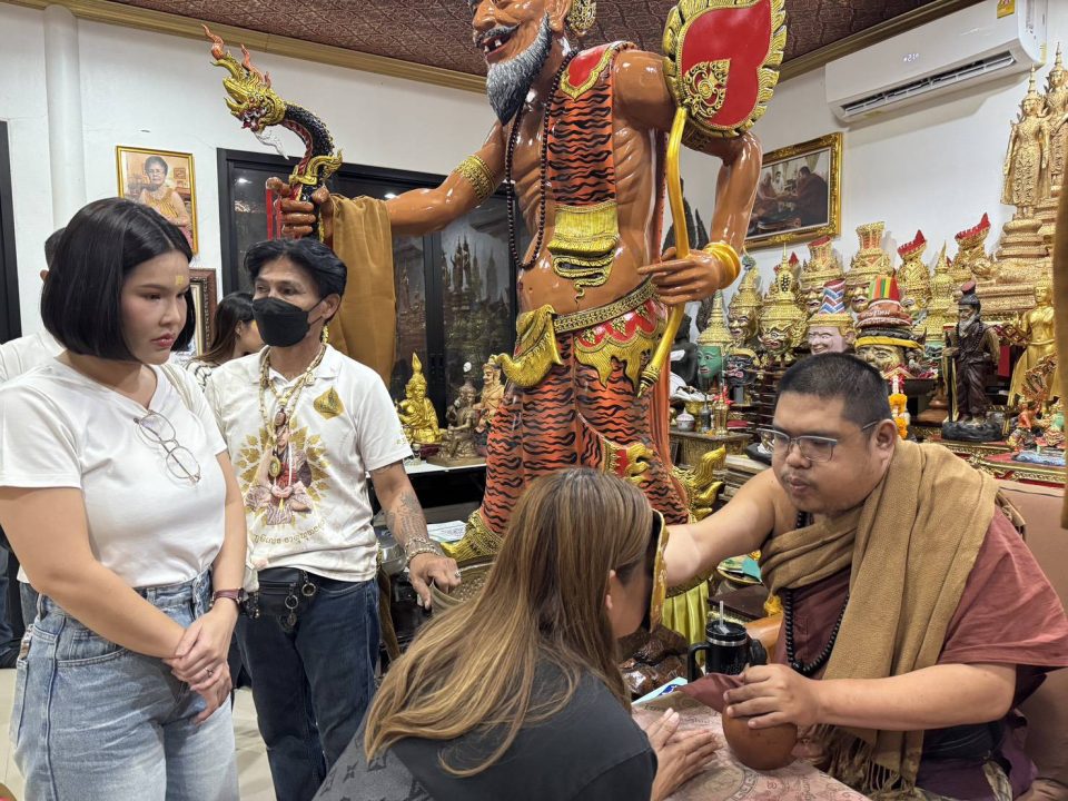 น.ส.นัยน์ณภัค พัฒนฐานิศร์ อายุ 33 ปี ชาว กทม. ที่เดินทางมาพร้อมครอบครัวเพื่อนำ รถมอเตอร์ไซค์ไฟฟ้าสำหรับเด็ก มาถวายแก้บนให้แก่ กุมารทองเจ้าสัวเฮง โดยเล่าว่า เดินทางมาที่นี่เป็นรอบที่ 3 แล้วค่ะ ล่าสุดมาขอพรให้การเทรดหุ้นประสบความสำเร็จ ได้กำไรตามเป้า 5,000 เหรียญ หรือประมาณ 180,000 บาท เมื่อได้สมความปรารถนาจึงรีบซื้อของมาแก้บนตามที่สัญญาไว้