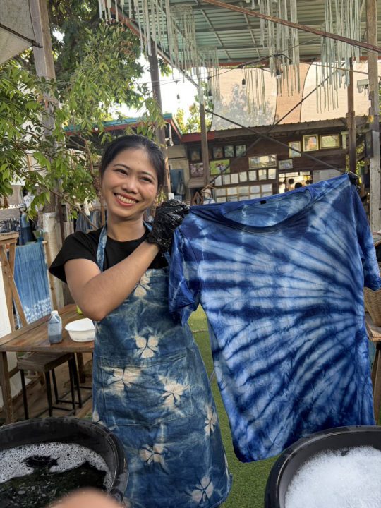 “ในอดีต เปิดร้านลาบเป็ดชื่อนกลาบเป็ด แต่ด้วยพิษเศรษฐกิจจึงหาอาชีพเสริมทำ แรกๆก็ไม่รู้อะไร ไม่เคยรู้ว่าครามทำยังไง แต่เมื่อปี 2555 ได้จับผ้าครามมาแล้วขายไป จึงค่อยๆเรีบนรู้ขึ้นมาเรื่อยๆ แรกๆก็หาความรู้จากแม่ๆหลายท่านซึ่งไม่มีสูตรทำน้ำครามที่ตายตัว ลองผิดลองถูก จนในที่สุดก็ประสบผลสำเร็จ ทำผ้าย้อมครามเริ่มตั้งแต่ปลูกต้นคราม น้ำมาทำเป็นน้ำครามย้อมลองดู ทำให้ครอบครัวตัวเองบ้าง ซึ่งก็โอเคตอบโจทก์ว่านี่คือตัวตนที่แท้จริงของเรา ขั้นตอนเริ่มจากการปลูกต้นครามแช่น้ำสกัดสีทำ “เนื้อคราม” ก่อหม้อครามด้วยน้ำขี้เถ้าและปูนขาว ย้อมผ้าฝ้ายด้วยวิธีมัดย้อมหรือย้อมจุ่ม ทอเป็นผืน ตากในที่ร่ม และตัดเย็บเป็นผลิตภัณฑ์ ก่อนทำตลาดทั้งออฟไลน์-ออนไลน์ เพจเฮือนนางคราม ที่นี่เรารับให้มาดูงาน จะเป็นสถาบันการศึกษา หรือกลุ่มต่างๆ มาเวิร์คช็อปโดยไม่เสียค่าใช้จ่าย เบอร์โทรติดต่อ 081-871-2945 ไม่เสียค่าใช้จ่ายแต่อาจมีค่าอุปกรณ์เท่านั้น