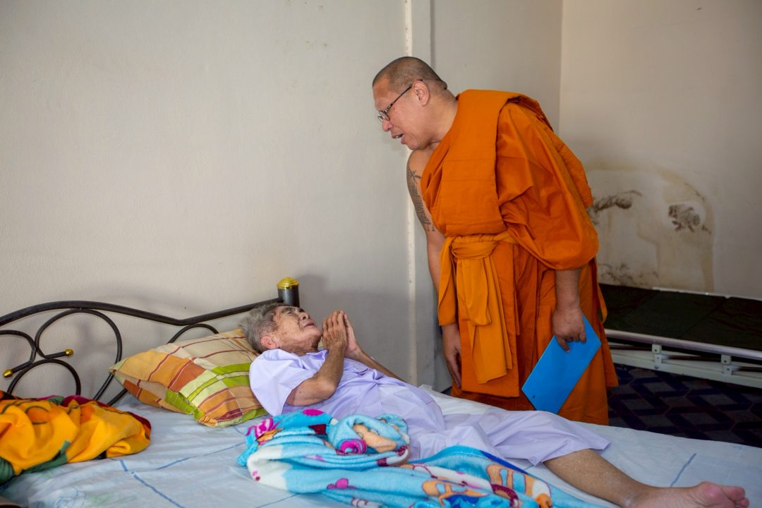 โดยเรื่องราวดังกล่าว พระครูปลัดสิทธิวัฒน์ (หลวงพี่น้ำฝน) ผู้รักษาการแทนเจ้าอาวาสวัดไผ่ล้อมพระอารามหลวง จังหวัดนครปฐม ได้นำคณะสงฆ์และเจ้าหน้าที่ประจำโครงการธนาคารแห่งกำลังใจ วัดไผ่ล้อมฯ ประสานงานกับ อสม.ตำบลพ่อพลับ เพื่อนำเตียงสำหรับผู้ป่วย ผู้ป่วย พร้อมรถวีลแชร์ ข้าวสาร น้ำดื่ม ของอุปโภค บริโภค ผ้าอ้อม เพื่อนำไปยังบ้านเลขที่ 116/5 ถ.ทหารบก 4 ต.บ่อพลับ อ.เมือง จ.นครปฐม ไปมอบให้กับ นางกุ้ยเง็ก แซ่แต้ อายุ 74 ปี ผู้ป่วยติดเตียง ที่ป่วยด้วยโรคเบาหวาน,โรคความดันโลหิตสูง,โรคกล้ามเนื้ออ่อนแรง,โรคกระดูกทับเส้น โดยมี พระดำรง ค้าทวี พระลูกชาย อายุ 45 ปี ซึ่งจำพรรษาอยู่วัดพระปฐมเจดีย์ ราชวรมหาวิหาร เป็นผู้ดูแลอยู่ไม่ห่าง