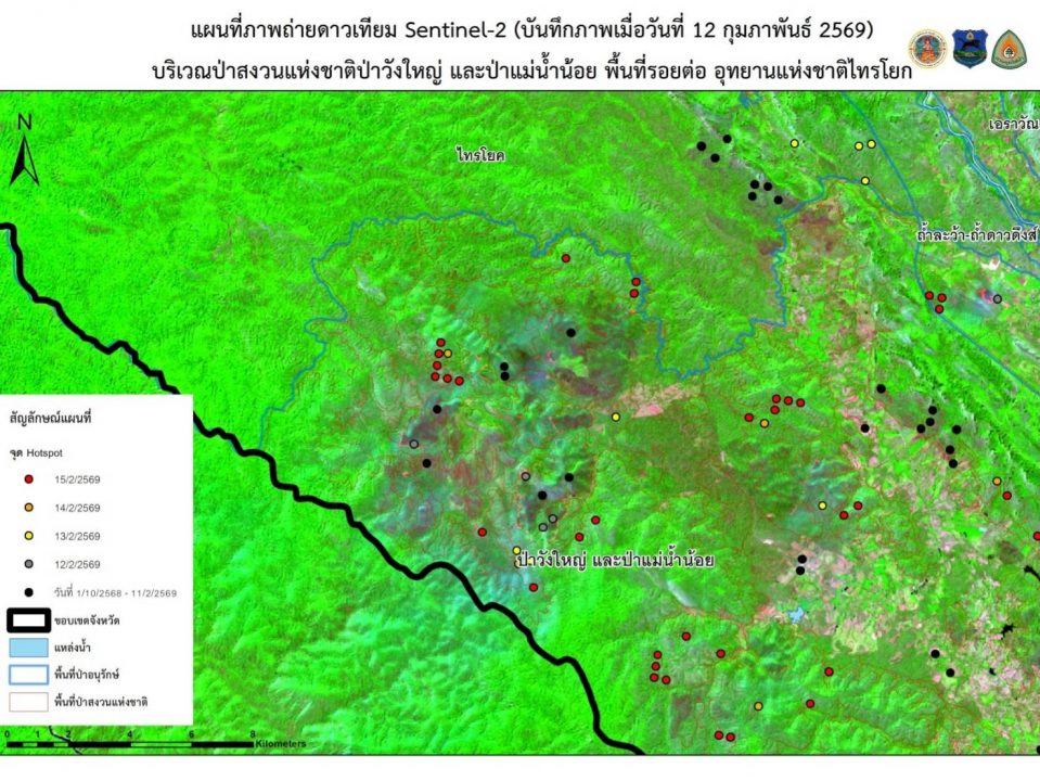 นายมานะ เพิ่มพูล ผู้อำนวยการส่วนควบคุมไฟป่า (สคฟ.) สำนักป้องกัน ปราบปราม และควบคุมไฟป่า กรมอุทยานแห่งชาติ สัตว์ป่า และพันธุ์พืช เปิดเผยถึงสถานการณ์ไฟป่าในพื้นที่จังหวัดกาญจนบุรี โดยนายพีร พวงมาลี หัวหน้าอุทยานแห่งชาติไทรโยค ได้จัดทำรายงานสถานการณ์ ระบุว่า จากการเฝ้าระวังอย่างใกล้ชิด กลุ่มไฟกระจายตัวเป็นจำนวนมาก โดยเฉพาะในเขตป่าสงวนแห่งชาติป่าวังใหญ่และป่าแม่น้ำน้อย ซึ่งเป็นพื้นที่รอยต่อสำคัญระหว่างอุทยานแห่งชาติไทรโยค สวนป่าองค์การอุตสาหกรรมป่าไม้ (สวนป่าไทรโยค) และชายแดนสาธารณรัฐแห่งสหภาพเมียนมา ในกลุ่มป่าที่ 12 (รอบเขื่อนศรีนครินทร์) ซึ่งพบทิศทางไฟกำลังลุกลามมุ่งหน้าเข้าสู่อุทยานแห่งชาติไทรโยค บริเวณเขาปลาน้อย เขาพลู และพื้นที่เหมืองเต่าดำอย่างน่ากังวล