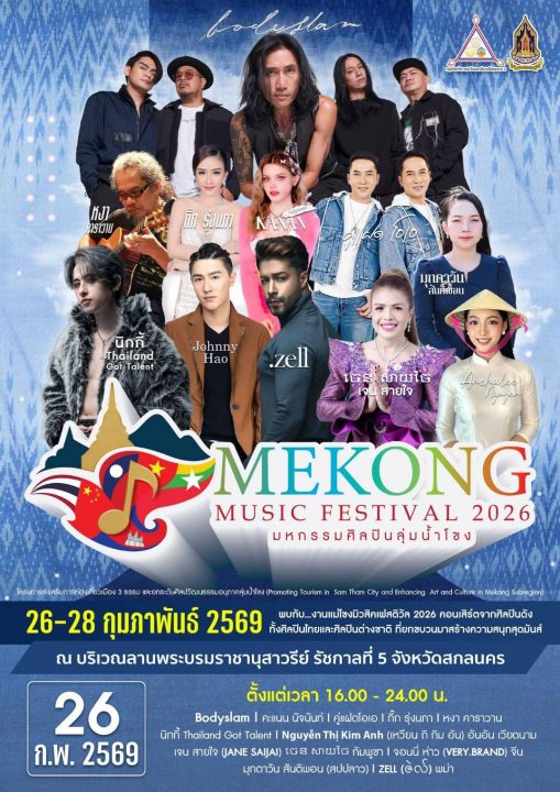 จัดเต็ม 3 วัน 3 คืน! สนุกไปกับศิลปินแถวหน้า อาทิ Bodyslam | Getsunova | Klear เต๋า ภูศิลป์, เอิ้นขวัญ วรัญญา, เต๊ะ ตระกูลตอ, คะแนน นัจนันท์ และทัพศิลปิน GMS อีกเพียบ! วันที่ 26 – 28 กุมภาพันธ์ 2569 ตั้งแต่ 16.00 – 24.00 น. ชมฟรีตลอดงาน! มาสัมผัสเสน่ห์ “เมือง 3 ธรรม” และยกระดับศิลปวัฒนธรรมลุ่มน้ำโขงไปพร้อมกัน! ขอเชิญชวนพี่น้องและมิตรรักแฟนเพลงทุกท่าน ไปร่วมสนุกสนานกับบรรยากาศงานคอนเสิร์ต และไปให้กำลังใจศิลปินจาก 6 ประเทศ อย่าลืมมาเที่ยวกันเยอะๆ นะครับ