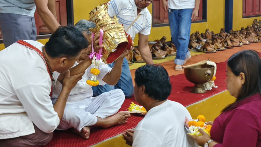 จากนั้นได้ทำพิธีสวดมนต์ พิธีครอบครูโดยตาบันเทิง รื่นพงษ์ อายุ 75 ปี เป็นเจ้าพิธีครอบครูให้กับบรรดาลูกศิษย์ โดยคุณตาบันเทิง เป็นลูกของหลวงพ่อปลั่ง ที่สืบทอดวิชาอาคมมาจากหลวงพ่อปลั่ง ทีเสียชีวิตไปแล้ว ซึ่งชาวบ้านผู้ประสบความสำเร็จและมาร่วมงานแก้บนประจำทุกปี เปิดเผยว่า ทางวัดได้ประกอบพิธีมาโดยตลอด ถึงปัจจุบันนี้ โดยมีลูกศิษย์ทั่วประเทศโดยทุกคนจะรู้ว่าวันนี้เป็นวันไหว้ครูก็จะนำหัวหมูมาแก้บนกัน ซึ่งปีนี้ชาวบ้านนำหัวหมูมาทั้งหมด 500 กว่าหัว