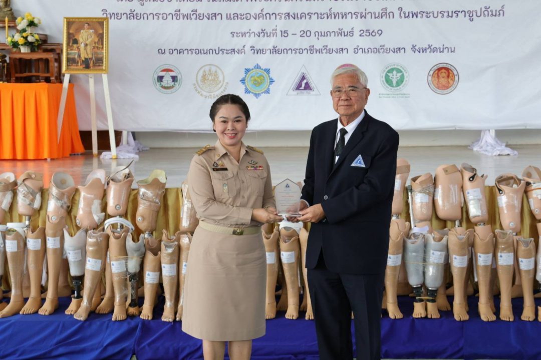 นางสาวณัฐยาน์ ทวีวงศ์ รองผู้ว่าราชการจังหวัดน่าน เป็นประธานในพิธีมอบขาเทียมพระราชทานแก่คนพิการขาขาดในจังหวัดน่านตามโครงการออกหน่วยทำขาเทียมพระราชทานเคลื่อนที่ ครั้งที่ 176 ซึ่งมูลนิธิขาเทียม ในสมเด็จพระศรีนครินทราบรมราชชนนี ร่วมกับจังหวัดน่าน วิทยาลัยการอาชีพเวียงสา และองค์การสงเคราะห์ทหารผ่านศึก ในพระบรมราชูปถัมภ์ จัดขึ้นเพื่อถวายเป็นพระราชกุศลแด่ สมเด็จพระนางเจ้าสิริกิติ์ พระบรมราชินีนาถ พระบรมราชชนนีพันปีหลวง ระหว่างวันที่ 15 – 20 กุมภาพันธ์ 2569 ในการจัดทำขาเทียมให้แก่คนพิการขาขาดทุกเชื้อชาติและศาสนา โดยไม่คิดมูลค่า ณ อาคารอเนกประสงค์ วิทยาลัยการอาชีพเวียงสา ตำบลนาเหลือง อำเภอเวียงสา จังหวัดน่าน.