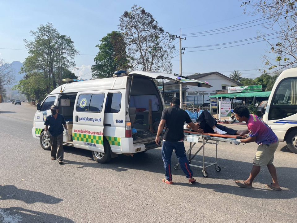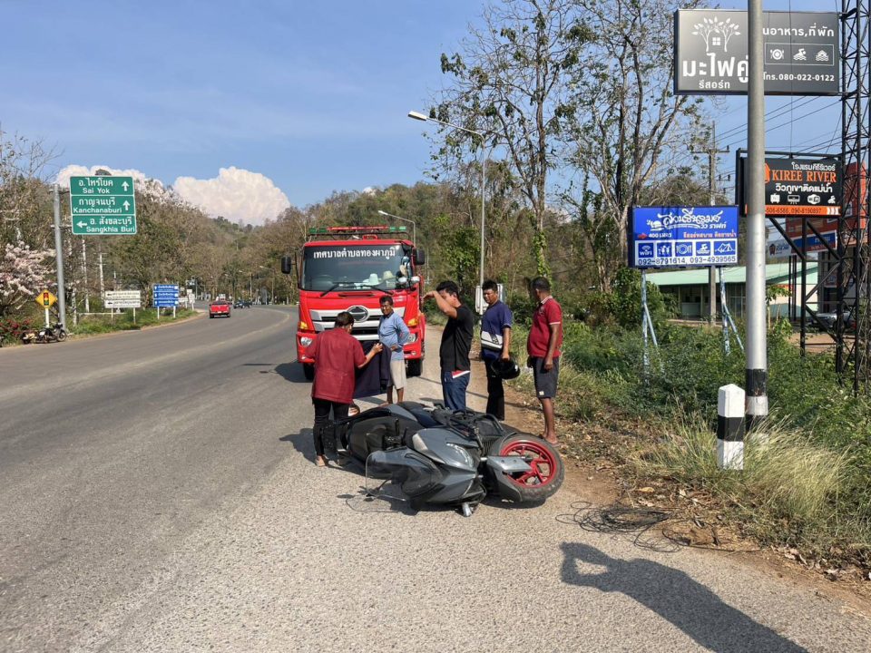 เจ้าหน้าที่งานป้องกันและบรรเทาสาธารณภัย เทศบาลตำบลทองผาภูมิ ร่วมกับมูลนิธิกู้ภัยกาญจนบุรี เขตทองผาภูมิ เข้าช่วยเหลือคนขี่มอเตอร์ไซค์ล้มบริเวณถนนเลยสามแยกทองผาภูมิก่อนข้ามสะพานปูนไปทางตลาด ม.1 ต.ท่าขนุน อ.ทองผาภูมิ จ.กาญจนบุรี คนบาดเจ็บลงนั่งข้างรถมอเตอร์ไซค์ มีเลือดออกบริเวณเท้าข้างขวา และเจ็บบริเวณไหล่ข้างขวา ไม่สามารถลุกขึ้นยืนได้ เจ้าหน้าที่ช่วยกันปฐมพยาบาลเบื้องต้น เพื่อนำตัวขึ้นรถกู้ภัยไปรักษาตัวต่อที่ รพ.ทองผาภูมิ ทราบชื่อคนเจ็บ ร.ต.ท.พยอม นาเครือ อายุ 70 ปี อยู่บ้านเลขที่ 287/22 ม.4 บ้านอู่ล่อง ต.ท่าขนุน อ.ทองผาภูมิ จ.กาญจนบุรี อดีตเป็นตำรวจสภ.ทองผาภูมิ เกษียณอายุราชการมา 10 ปี