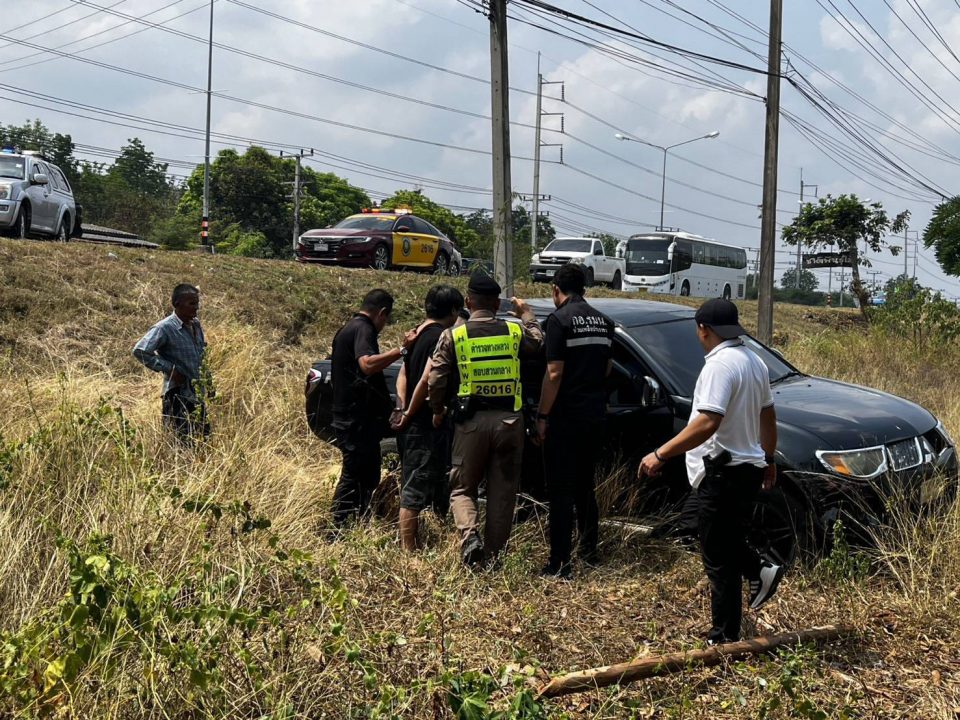ระหว่างนั้นเจ้าหน้าที่ตำรวจทางหลวงชุดติดตามได้ประสานไปยัง เจ้าหน้าที่ทหาร ชุด ชป.ขว.กกล.สุรสีห์ และเจ้าหน้าที่ กอ.รมน.กาญจนบุรี นำกำลังมาร่วมกันสกัดจับ ขณะเจ้าหน้าที่ไล่ติดตามได้พยายามประชาสัมพันธ์ผ่านลำโพงเพื่อให้คนขับหยุดรถตลอดเส้นทาง ถึงแม้เจ้าหน้าที่จะพยายามขับรถปิดหน้าปิดหลังก็ตาม แต่คนขับก็ไม่ยอมจำนน สร้างความหวาดเสียวให้กับผู้ที่เห็นเหตุการณ์เป็นอย่างมาก จนกระทั่งไปถึงบริเวณหลัก กม.ที่ 71-72 ต.หนองบัว อ.เมือง จ.กาญจนบุรี เจ้าหน้าที่สามารถขับรถประกบเอาไว้ได้ แต่คนขับกลับหักรถพุ่งลงจากถนนที่ลึกประมาณ 2 เมตร คนขับได้เปิดประตูแล้วพยายามวิ่งหลบหนี เจ้าหน้าที่จึงวิ่งติดตามและสามารถจับกุมตัวคนขับรายดังกล่าวเอาไว้ได้ ทราบชื่อต่อมาคือนายต้นรัก อายุ 21 ปี