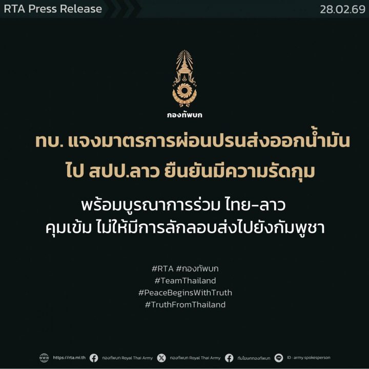 ที่กองบัญชาการกองทัพบก พลตรี วินธัย สุวารี โฆษกกองทัพบก ชี้แจงถึงการผ่อนปรนมาตรการควบคุมการส่งออกน้ำมันเชื้อเพลิงไปยังสาธารณรัฐประชาธิปไตยประชาชนลาว (สปป.ลาว) หลังจากที่ก่อนหน้านี้ได้มีการระงับการส่งออกตั้งแต่วันที่ 14 ธันวาคม 2568 เพื่อสกัดกั้นการลักลอบส่งออกน้ำมันไปยังประเทศกัมพูชาด้วยเหตุผลด้านความมั่นคง โฆษกกองทัพบกย้ำว่า กองทัพบกยังคงให้ความสำคัญกับสถานการณ์ความมั่นคงตามแนวชายแดนอย่างใกล้ชิด รวมถึงต้องพิจารณาปัจจัยต่างๆ ให้ครอบคลุมในทุกมิติ ทั้งด้านความมั่นคง ผลกระทบต่อประชาชน เศรษฐกิจ และความสัมพันธ์ระหว่างประเทศ