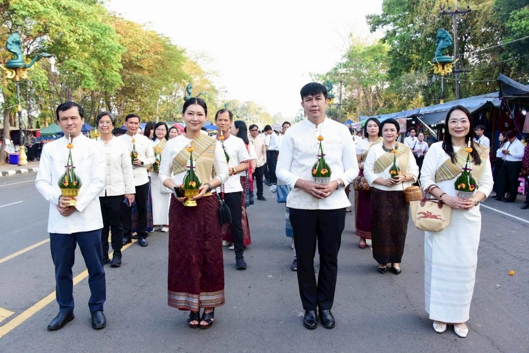 ที่พระบรมธาตุนาดูน อำเภอนาดูน จังหวัดมหาสารคาม มหาวิทยาลัยมหาสารคาม โดย รองศาสตราจารย์ ดร.ประยุกต์ ศรีวิไล อธิการบดีมหาวิทยาลัยมหาสารคาม นำคณะผู้บริหาร บุคลากร นิสิตมหาวิทยาลัยมหาสารคาม ร่วมจัดขบวนแห่ในพิธีเปิดงานนมัสการพระบรมธาตุนาดูน ประจำปี 2569 โดยในปีนี้มหาวิทยาลัยมหาสารคาม ได้เป็นขบวนนำในการจัดขบวนเครื่องสักการะและเครื่องพีชภาคอย่างยิ่งใหญ่ เพื่อรื้อฟื้นและสืบสานคติความเชื่อทางศาสนาที่ผสานพุทธมหายานสมัยทวารวดีเข้ากับจารีตอีสานล้านช้างอย่างกลมกลืน ซึ่ง“เครื่องพีชภาค” (อ่านว่า พี-ชะ- พาก) หมายถึงเครื่องสักการะที่ประกอบด้วยเมล็ดพืชและธัญพืชมงคล ขบวนเครื่องบูชาแบ่งเป็น 2 รูปแบบหลัก ได้แก่ เครื่องสักการะแบบมหายานทวารวดี ตามแนวคิด “อัษฏบูชา” หรือเครื่องบูชา 8 ประการ ได้แก่ น้ำสะอาด รัตนะ ดอกไม้ ธูป ประทีป น้ำหอม อาหาร และดนตรี เพื่อฝึกจิตให้เกิดทานบารมี และ ขบวนเครื่องสักการะตามจารีตอีสานล้านช้าง ซึ่งโดดเด่นด้วย “เครื่องพีชภาค” หรือธัญพืชมงคล สื่อถึงความอุดมสมบูรณ์ทางเกษตรกรรม