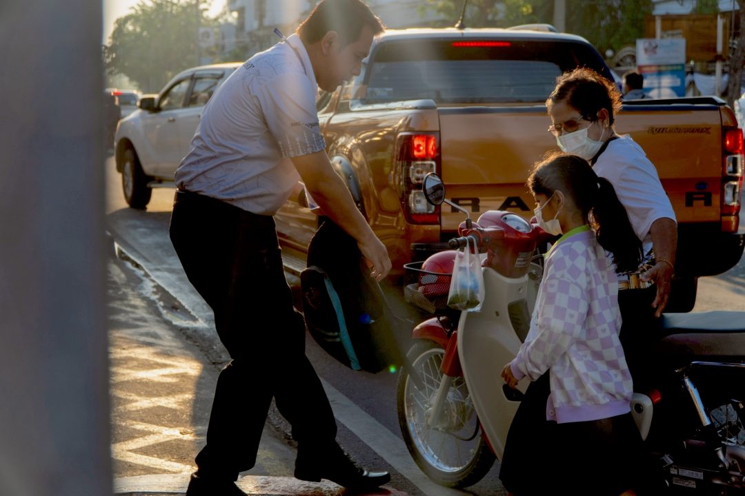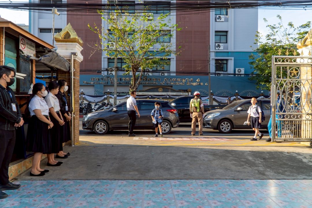 โดยผู้สื่อข่าว ได้ลงพื้นที่บริเวณถนนเทศาซอย 5 ที่หน้าโรงเรียนอนุบาลนครปฐม ตำบลพระปฐมเจดีย์ อำเภอเมือง จังหวัดนครปฐม ซึ่งพบว่าตั้งแต่เวลา 07.15 น. จะมีครูชาย ยืนรอรับนักเรียนอยู่ที่หน้าประตูโรงเรียน โดยการรับกระเป๋าจากผู้ปกครองที่ขับรถยนต์และรถจักรยานยนต์มาส่งบุตรหลาน และพยุงนักเรียนเพื่อให้มีความกระฉับกระเฉงในการลงจากรถด้วยความรวดเร็วและปลอดภัย ส่วนที่บริเวณถนนเทศา ซึ่งตรงกันข้ามกับหน้าวิทยาลัยอาชีวศึกษานครปฐม ก็จะมีครูอาจารย์ และเจ้าหน้าที่ทำการโบกรถตีธงแดง บอกจังหวัดให้รถที่สัญจรไปมาหยุดขณะที่นักเรียนตั้งแต่เด็กอนุบาลและชั้นประถมศึกษากำลังเดินข้ามถนนเพื่อความปลอดภัย ส่วนที่ในโรงเรียนจะมีครูอาจารย์และครูฝึกสอนคอยรับนักเรียนอีกชั้นหนึ่ง ท่ามกลางการจราจรที่คับคั่งในช่วงเช้า เนื่องจากเป็นช่วงเวลาที่นักเรียนและข้าราชการรวมถึงพนักงานบริษัทจะเร่งรีบออกมาส่งบุตรหลานและไปทำงาน ซึ่งเป็นการทำงานร่วมกันกับเจ้าหน้าที่ตำรวจ จราจรของ สภ.เมืองนครปฐม ที่คอยมาโบกรถเพื่อเร่งระบายการจราจรในช่วงเร่งรีบของทุกเช้าในวันเวลาราชการ