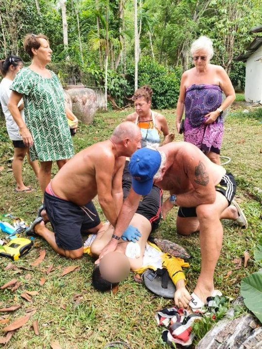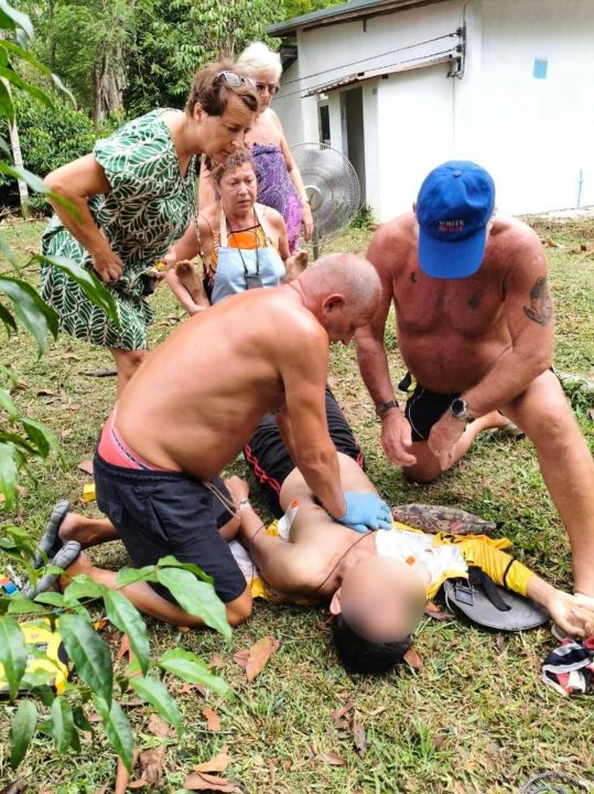 และได้รับแจ้งจากผู้แจ้งว่ามีอดีตทีมแพทย์จากประเทศนอร์เวย์ที่มาท่องเที่ยวจังหวัดกระบี่ กำลังให้การช่วยเหลือ CPR ร่วมกับใช้ครื่อง AED กดปุ๋มช็อคไปทั้งหมด 4 รอบ เพื่อช่วยฟื้นคืนชีพผู้ป่วยระหว่างรอหน่วยกู้ชีพเข้าไปรับ ผลการรักษาผู้ป่วยกลับมามีสัญญาณชีพอีกครั้งและรักษาต่ออยู่ที่โรงพยาบาลกระบี่ ซึ่งมีระยะทาง 21 กิโลเมตร ซึ่งใช้ระยะทางในการเดินทางค่อนข้างไกลจากโรงพยาบาล