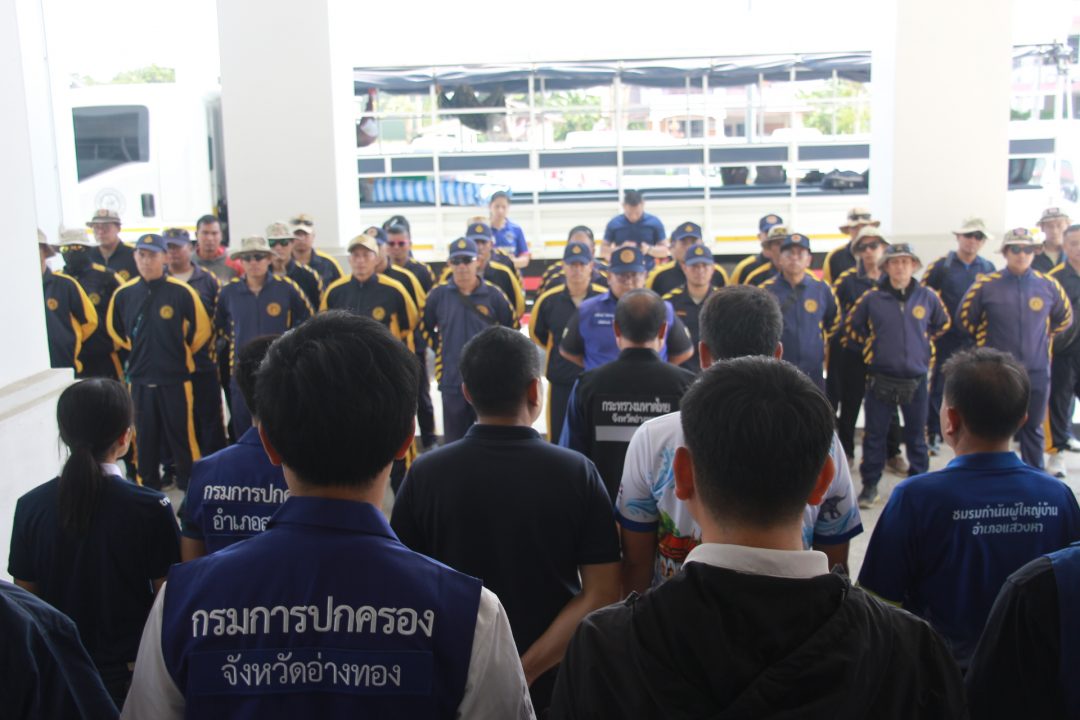 ด้าน นายไพบูลย์ ศุภบุญ รองผู้ว่าราชการจังหวัดอ่างทอง ได้กล่าวให้กำลังใจและขอบคุณ สมาชิก อส. ที่เสียสละไปปฏิบัติหน้าที่ในครั้งนี้ พร้อมเน้นย้ำเรื่องการปฏิบัติงานด้วยความปลอดภัย รักษาระเบียบวินัย และช่วยเหลือซึ่งกันและกัน ภารกิจในครั้งนี้ เมื่อกลับมาแล้วย่อมได้รับคำชื่นชมและความภาคภูมิใจกลับมา เช่นเดียวกับเมื่อครั้งไปช่วยฟื้นฟูเมืองหาดใหญ่ จังหวัดสงขลา หลังประสบอุทกภัย และขอให้ทุกคนร่วมกันฝ่าฟันสถานการณ์นี้ไปให้ได้