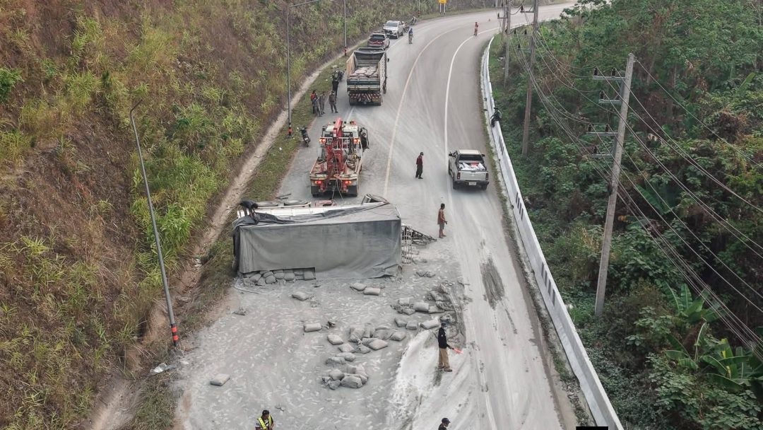 นายวรศักดิ์ พานทอง นายอำเภอแม่สะเรียง จ.แม่ฮ่องสอน เปิดเผยว่า ได้รับแจ้งเหตุว่ามีรถบรรทุกปูน ( ลูกพ่วง ) พลิกคว่ำบนทางหลวงแผ่นดินหมายเลข 108 แม่สะเรียง – ฮอด จ.เชียงใหม บริเวณพื้นที่ระหว่างหมู่บ้านแม่เหาะ – บ้านป่าจี้ หมู่ 4 ต.แม่เหาะ อ.แม่สะเรียง จ.แม่ฮ่องสอน โดยถนนบริเวณดังกล่าวรถสามารถวิ่งผ่านได้เพียงเลนเดียวจากปกติ 2 เลน