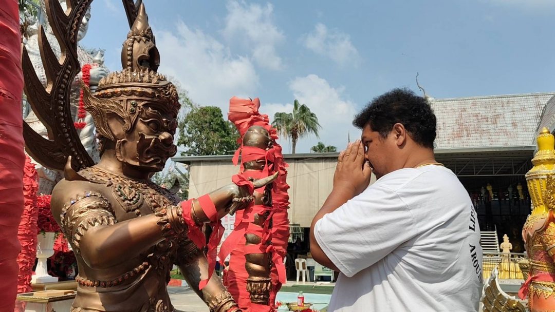 ทางด้านนายยุรนันท์ ทัศนา นำน้ำแดง 9 ขวด กุกลาบ 9 ดอกพร้อมด้วยเครื่องเซ่นไหว้มาแก้บนท้าวเวสสุวรรณหลังลูกชายสอบเข้าโรงเรียนดังได้สำเร็จ นายยุรนันท์กล่าวว่าตนเดินทางมาเพื่อแก้บนกับท้าวเวสสุวรรณในเรื่องลูกชายที่สามารถสอบติดเข้าเรียนต่อได้ตามที่ลูกชายของตนได้ตั้งเป้าหมายไว้ ซึ่งลูกชายของตนนั้นต้องการสอบเข้าเรียนที่โรงเรียนสวนกุหลาบปทุมธานี นายยุรนันท์ยังกล่าวอีกว่าแม้ส่วนตัวตนและภรรยาจะมีความมั่นใจในความสามารถของลูกชายอยู่แล้วก็ตาม แต่การพรนั้นถือเป็นที่พึ่งทางใจอย่างหนึ่งตามความเชื่อของชาวพุทธที่ช่วยให้เกิดความสบายใจและสร้างความเป็นสิริมงคลให้แก่ครอบครัวในช่วงเวลาสำคัญของการเริ่มต้นการศึกษาใหม่ของลูกชาย ซึ่งภรรยาขอตนได้ขอพรกับท้าวเวสสุวรรณไว้ตั้งแต่ช่วงก่อนสอบในช่วงเดือนที่ผ่านมา หลังจากสอบเสร็จอีกประมาณ 1 เดือนทางโรงเรียนก็ประกาศผลสอบออกมาแล้วผลปรากฎว่าลูกชายของตนก็สอบติดได้เข้าเรียนจริง และวันนี้เป็นวันมอบตัวของลูกชายที่โรงเรียนพอดี ตนจึงถือโอกาสพาครอบครัวเดินทางมาแก้บนตามที่ได้สัญญาเอาไว้ดังกล่าว และก่อนกลับยังได้จุดธูปเสี่ยงทายได้เลข 80 นำกลับลุ้นโชคอีกด้วย